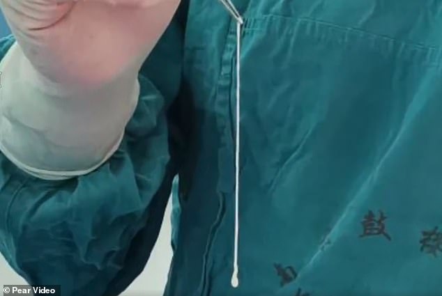 Revolting footage shows the white parasite wiggling in a bowl after it was removed from the patient.
