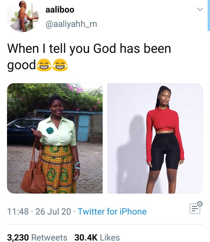 In one of the photos, the woman was much bigger. In the second photo, she had slimmed down considerably and her fashion sense had also transformed, looking like a gorgeous slay queen.
