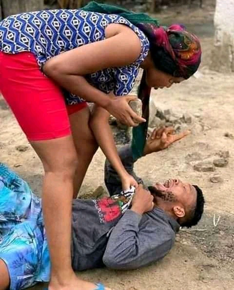 Presently, a picture is circulating online. This picture shows two persons fighting on the street. On the ground is a man pleading for mercy as the girl beats him continuously. The girl is seen holding an object on her hand as she tried to strike him.