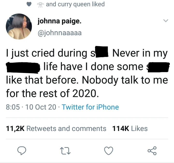 She said in her post that "I just cried during x. Never in my life have I done something like that before. Nobody talks to me for the rest of 2020".